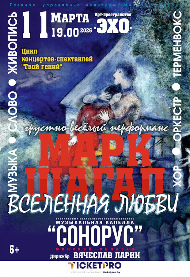 А благодаря звучанию хора, струнных, духовых и терменвокса в сочетании с проекциями картин художника, мы погрузимся в волшебную атмосферу Витебска, Санкт-Петербурга, Парижа, а затем и вовсе "улетим" в "шагаловское" пространство между реальностью и фантастикой!