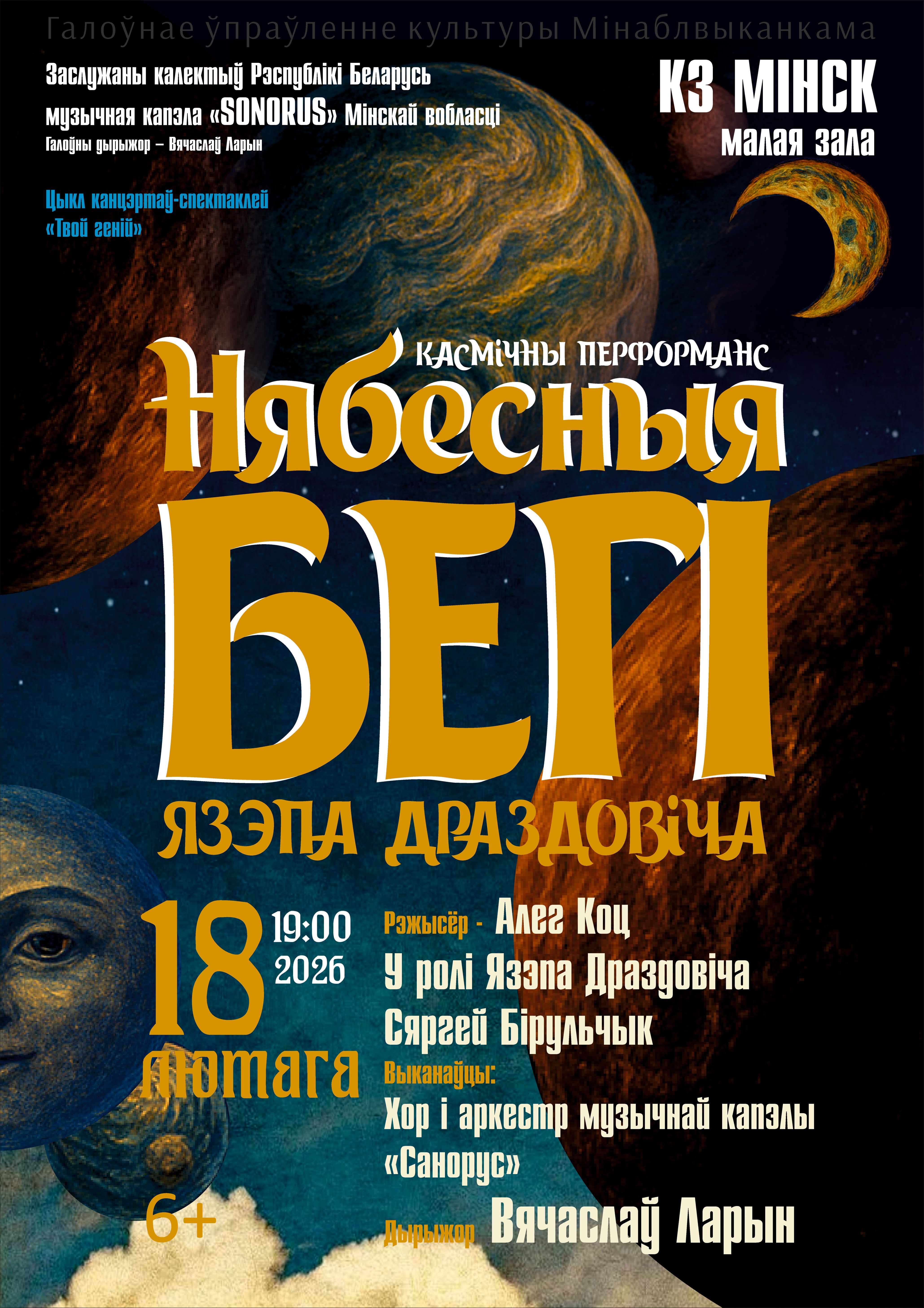 Музыкальная капелла "Сонорус" Минской области под управлением главного дирижёра Вячеслава Ларина, в сотрудничестве с основателем Театра на Немиге, режиссёром Олегом Коцем, и актёром Национального академического театра им. Янки Купалы Сергеем Бирульчиком, представит уникальную музыкально-драматическую фантазию, исследующую жизнь и творчество этого белорусского гения.