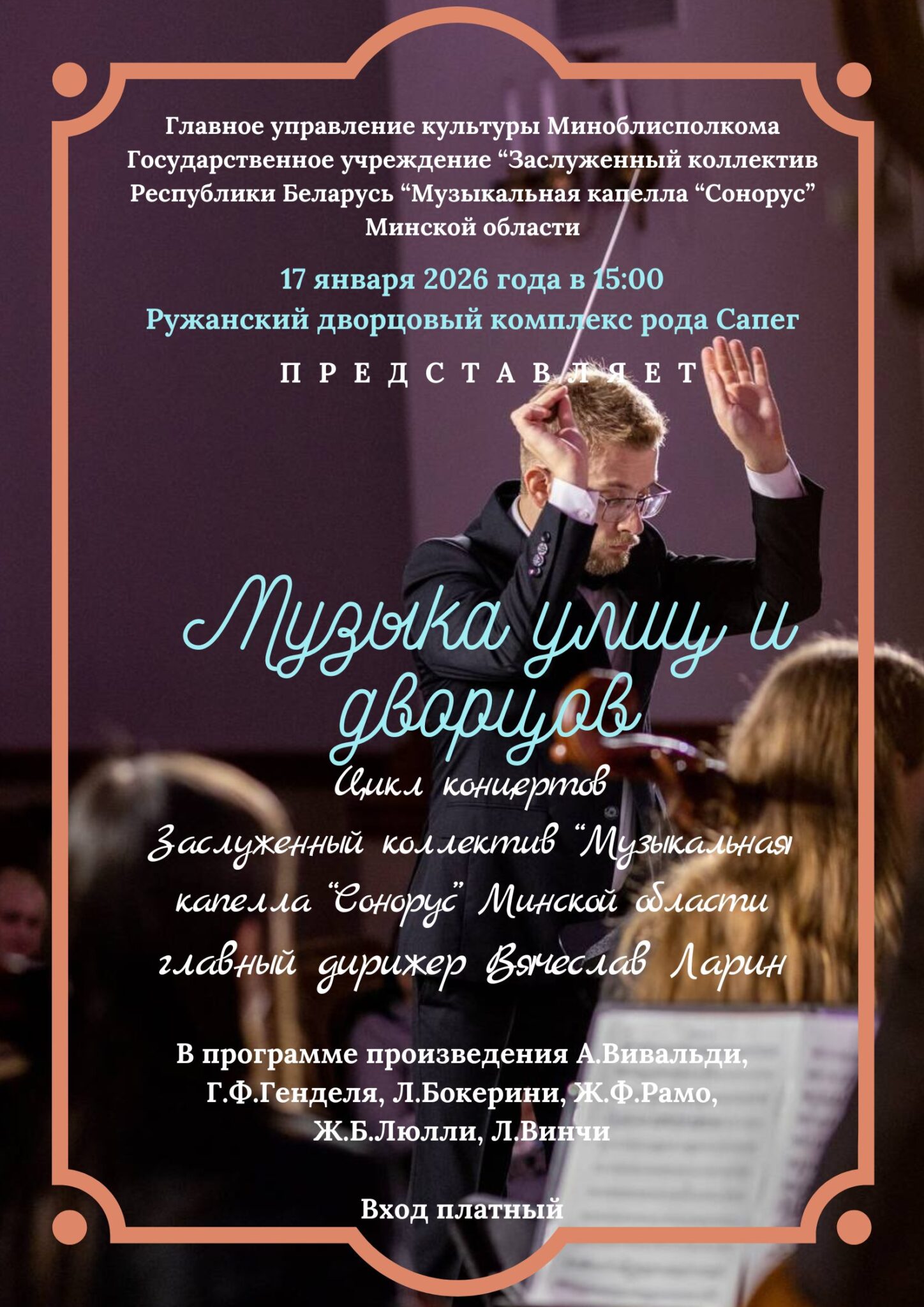 17 января 2026 года в Ружанском дворцовом комплексе рода Сапег состоится презентация концертной программы «Музыка улиц и дворцов» Заслуженного коллектива «Музыкальная капелла «Сонорус» Минской области под руководством главного дирижера Вячеслава Ларина. В программе будут представлены произведения А.Вивальди, Г.Ф.Генделя, Л.Бокерини, Ж.Ф.Рамо, Ж.Б.Люлли, Л.Винчи.